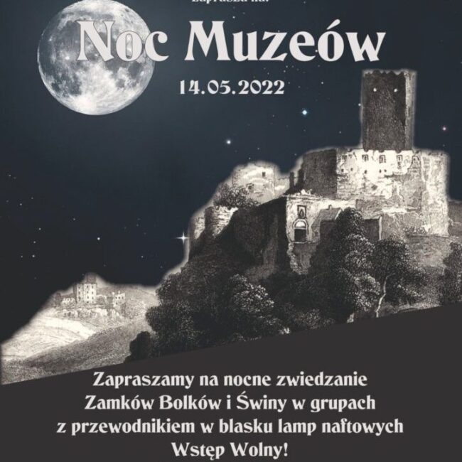 ZAPRASZAMY NA NOC MUZEÓW!W programie oprowadzanie po zamku Bolków i Świny w grupach w blasku latarninaftowych.Grupy ruszają o pełnych godzinach. Po sformowaniu grupy, uczestnicy dostaną latarnienaftowe i w ich świetle…