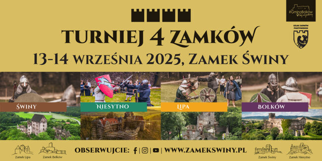 Turniej Czterech zamków Trzecia Edycja Turnieju Czterech Zamków Pokazy konne, turniej łuczniczy, pokaz szermierki, konkurencje rycerskie, pokaz strzelecki i altyleryjski, muzyka na żywo Facebook